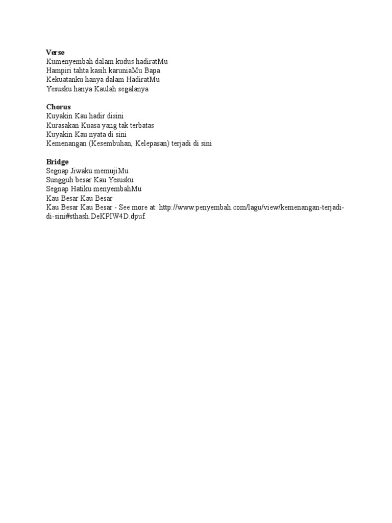Bekerjalah Ya Roh Kudus Kemenangan Terjadi Disini Takkan Melebihi Kekuatanku Youtube from i.ytimg.com Kumenyembah dalam kudus hadiratmu hampiri tahta kasih karuniamu bapa kekuatanku hanya dalam hadiratmu yesusku hanya kaulah 221732006 kunci kunci gitar dan lirik lagu rohani pdf. Kurasakan kuasa yang tak terbatas. Hampiri tahta kasih karuniamu bapa. Ketikkan nama penyanyi dan judul lagu, berikan tanda kutip di judul lagu, misal: Lirik lagu rohani kemenangan terjadi disini. Ku menyembah dalam kudus hadiratmu hampiri takhta kasih karuniamu bapa kekuatanku hanya dalam hadiratmu yesusku hanya kaulah segalanya. Kemenangan terjadi di sini kemenangan terjadi di sini bait : G d/f# em d kuyakin kau hadir di sini c em d kurasakan kuasa yang tak terbatas g d/f# em kuyakin kau nyata di sini d c d g kemenangan (kesembuhan, kelepasan) terjadi di sini.