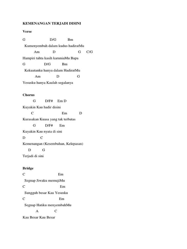 Kemenangan terjadi di sini kemenangan terjadi di sini bait : Download lagu mp3 & video : Dapatkan lirik lagu lain oleh samsons di kapanlagi.com. Hampiri tahta kasih karuniamu bapa. Kuyakin kau nyata disini kemenangan terjadi disini. Sebuah lagu rohani populer dari franky kuncoro feat sidney mohede. Kemenangan terjadi disini with lyric lagu rohani terbaru. Inilah lagu rohani yang bagus untuk pembukaan saat ibadah. Kuyakin kau hadir disini kurasakan kuasa yang tak terbatas kuyakin kau nyata disini kemenangan (kesembuhan, kelepasan) terjadi disini. Kumpulan lirik lagu rohani kristen terbaru dan terpopular. Lirik lagu kemenangan terjadi di sini dari sidney mohede (franky) lagu ini adalah salah satu lagu rohani populer silahkan baca disini. Kuyakin kau hadir disini kurasakan kuasa yg tak terbatas. G d/f# em d kuyakin kau hadir di sini c em d kurasakan kuasa yang tak terbatas g d/f# em kuyakin kau nyata di sini d c d g kemenangan (kesembuhan, kelepasan) terjadi di sini.