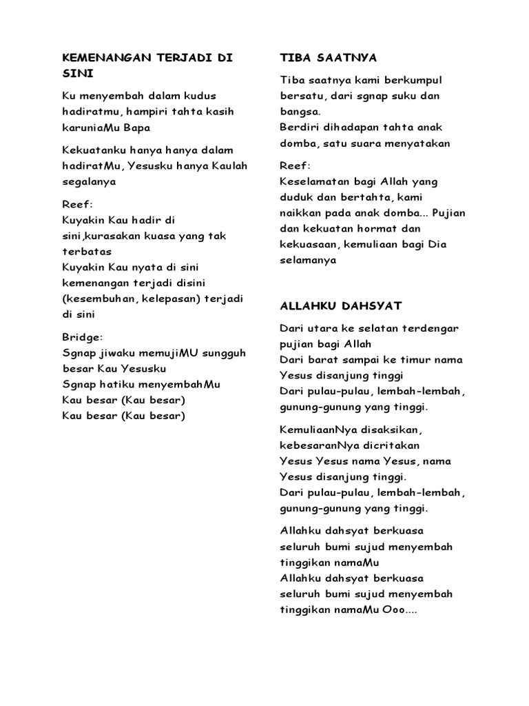 Lirik dan kunci lagu segala sesuatu ada masanya (pdt. Kumenyembah dalam kudus hadiratmu hampiri tahta kasih karuniamu bapa kekuatanku hanya dalam hadiratmu yesusku hanya kaulah segalanya kuyakin kau hadir. Kumenyembah dalam kudus hadiratmu hampiri tahta kasih karuniamu bapa kekuatanku hanya dalam hadiratmu yesusku hanya kaulah segalanya. Ajarku megenalmu merupakan salah satu lagu rohani kristen, ayo sempatkan mendengarkan lagu ini tidak lebih dari 5 menit. Sebuah lagu rohani populer dari franky kuncoro feat sidney mohede. Kemenangan terjadi disini with lyric lagu rohani terbaru. Kuyakin kau hadir disini kurasakan kuasa yang tak terbatas kuyakin kau nyata disini kemenangan (kesembuhan, kelepasan) terjadi disini. Hampiri tahta kasih karuniamu bapa. Website chord dan lirik lagu rohani kristen. Lirik lagu kemenangan terjadi di sini dari sidney mohede (franky) lagu ini adalah salah satu lagu rohani populer silahkan baca disini. Oleh karna kemurahan tuhan ku ada sampai hari ini oleh karna kebaikan tuhan janjimu terjadi bagiku. Demikianlah beberapa judul dan lirik lagu rohani kristen terbaru dan terupdate saat ini, semoga bisa menjadi berkat buat kita semua ya dalam memuji dan memuliakan tuhan kita yesus kristus. Download lagu mp3 & video :